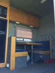 The truck has been configured professionally with a DINETTE (Converts to mini-queen/twin bed), has a futon/sofa (converts to Queen), full size refrigerator, microwave, ceiling A/C, House 12 Volt Batteries (need to be charged/replaced), built in overhead 12 volt lighting, carpeted living area (needs replacing soon), Holding tanks for grey & black water, 12 volt/propane heat for coach section, has dual tinted picture windows (featuring both translucent & black out cellular blinds!), and lockable RV access door (w/3 step pull out stairs (needs to be replaced soon), PLUS pass thru from front cab to box section!